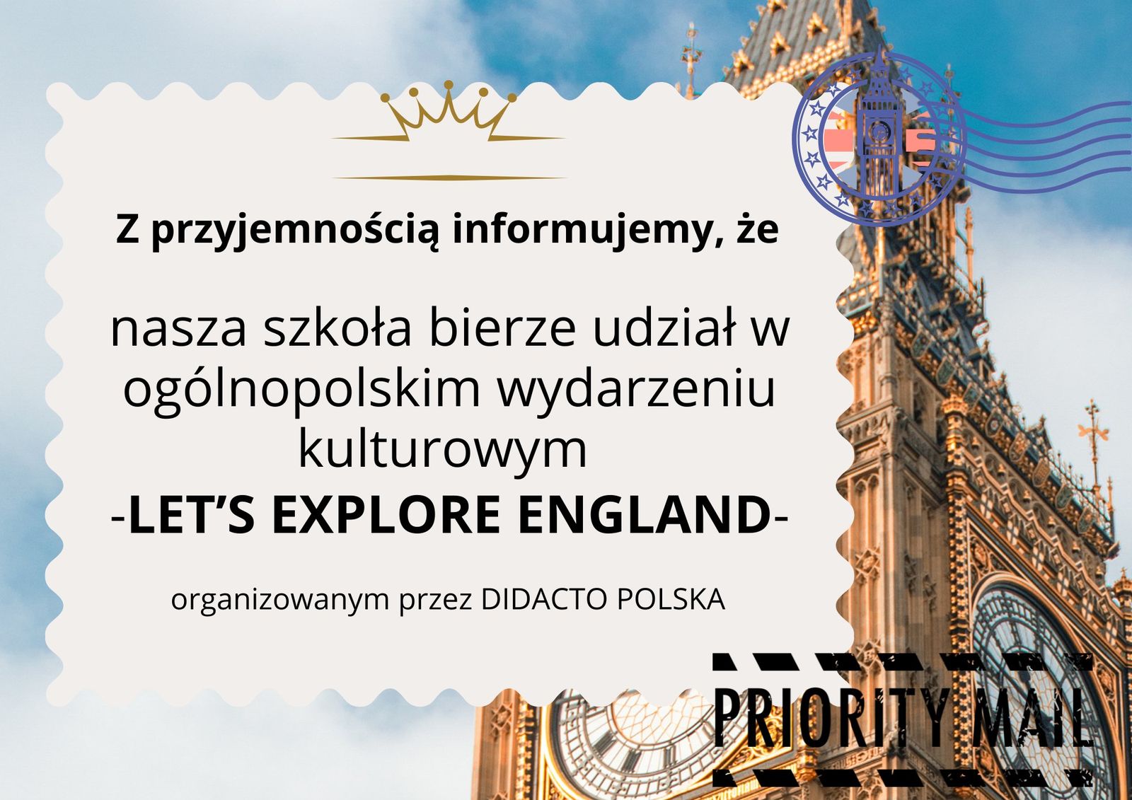 Zakończyliśmy już w naszej szkole wszystkie rozpoczęte w I semestrze działania podjęte w ramach ogólnopolskiego projektu językowego „Let’s Explore England”. Celem przedsięwzięcia było promowanie kultury Anglii poprzez zorganizowanie szkolnej wystawy, lekcji i konkursów w wybranych oddziałach klasowych. Uczniowie mieli okazję uczestniczenia w ciekawych zajęciach aktywizujących, tj. praca w parach i grupach z wykorzystaniem specjalnych kart edukacyjnych, projekcje filmowe, zamieszczanie gazetek kulturowych w salach lekcyjnych, a także rywalizowanie w konkursach i quizach z zakresu wiedzy geograficznej i historycznej Anglii. Nad całością projektu czuwały panie: Agnieszka Buczek, Dorota Lorenc i Justyna Szolc. Dziękujemy wszystkim za udział we wspólnej zabawie i zachęcamy do uczestnictwa w kolejnych projektach językowych.