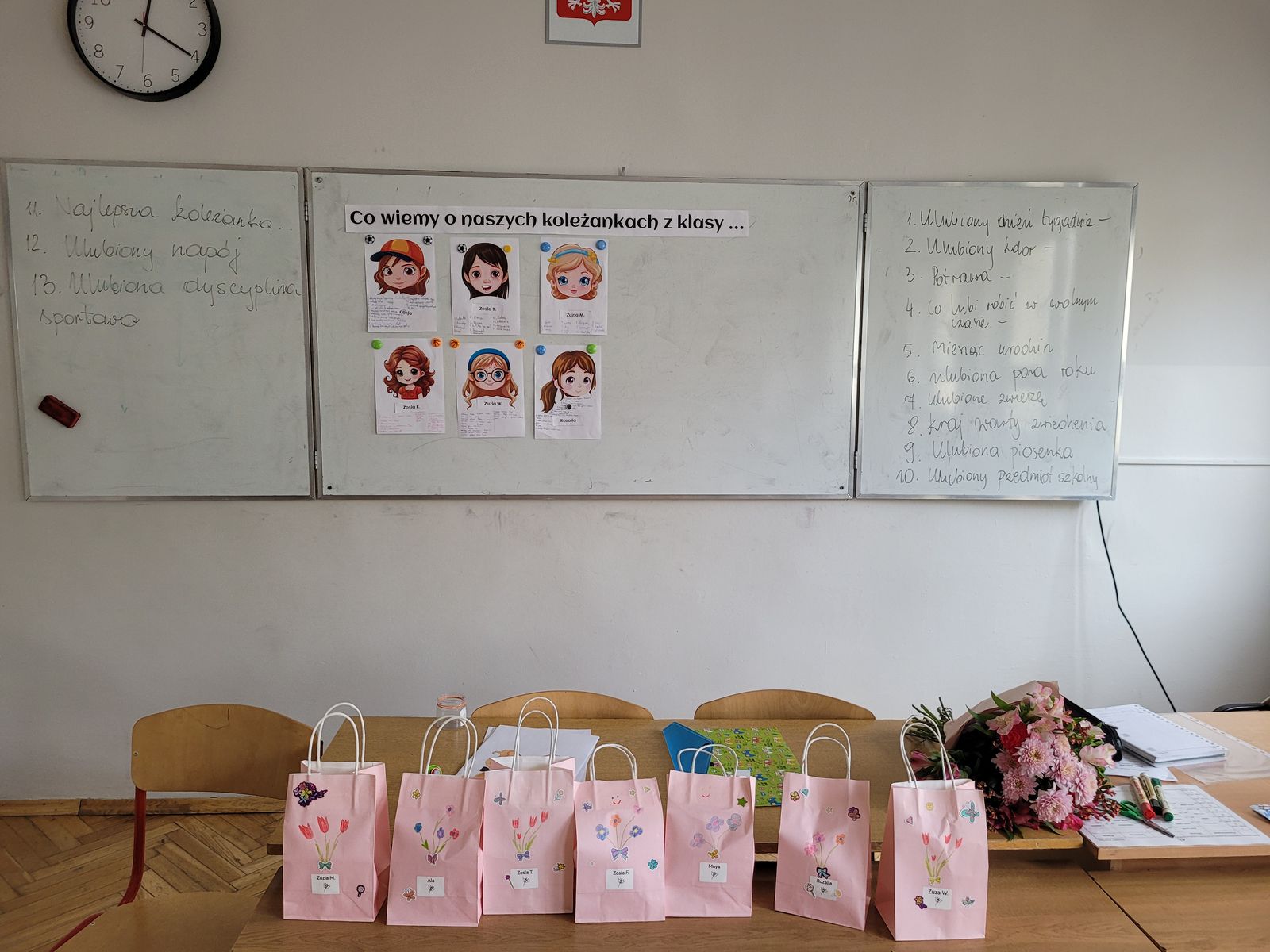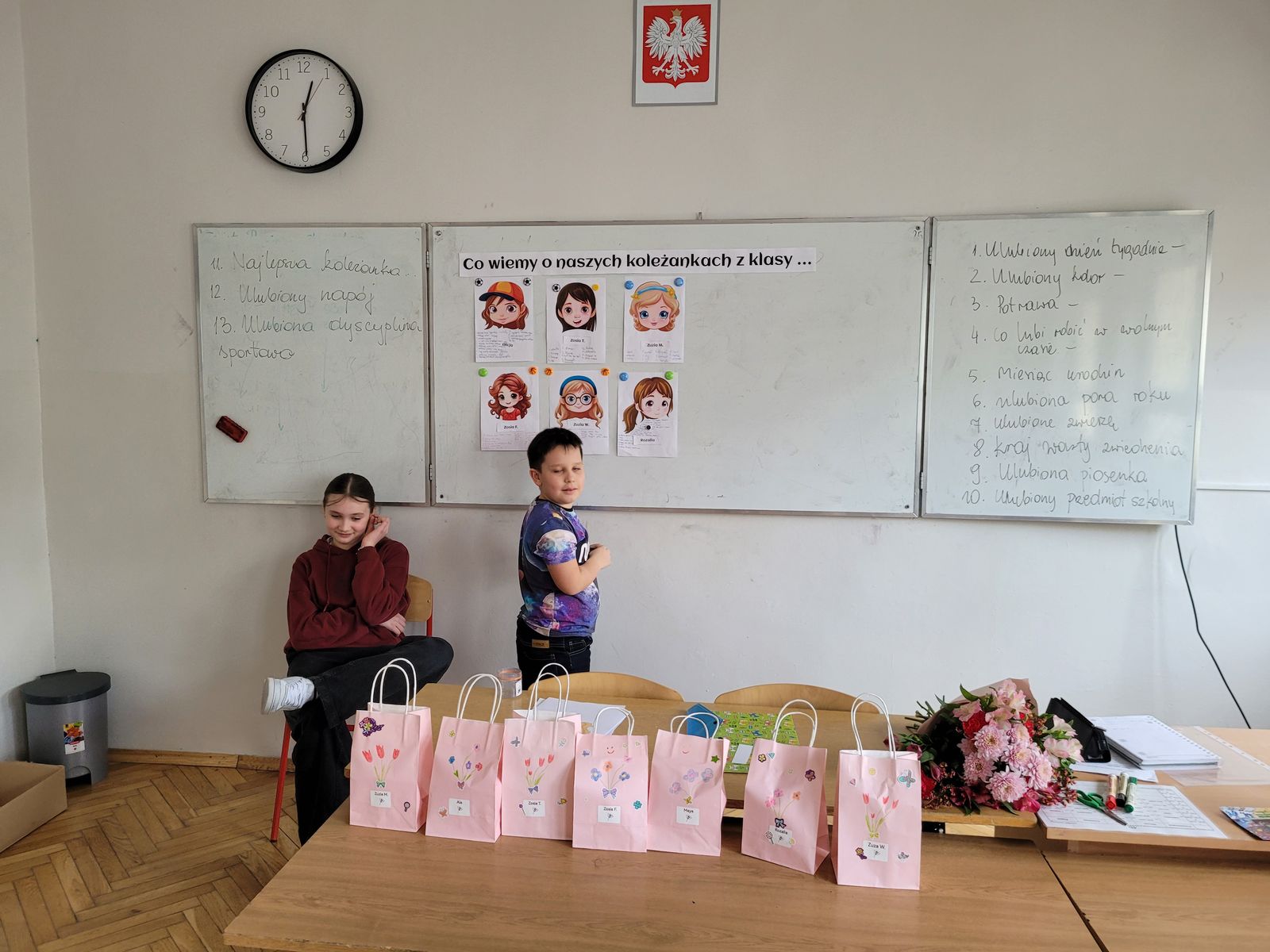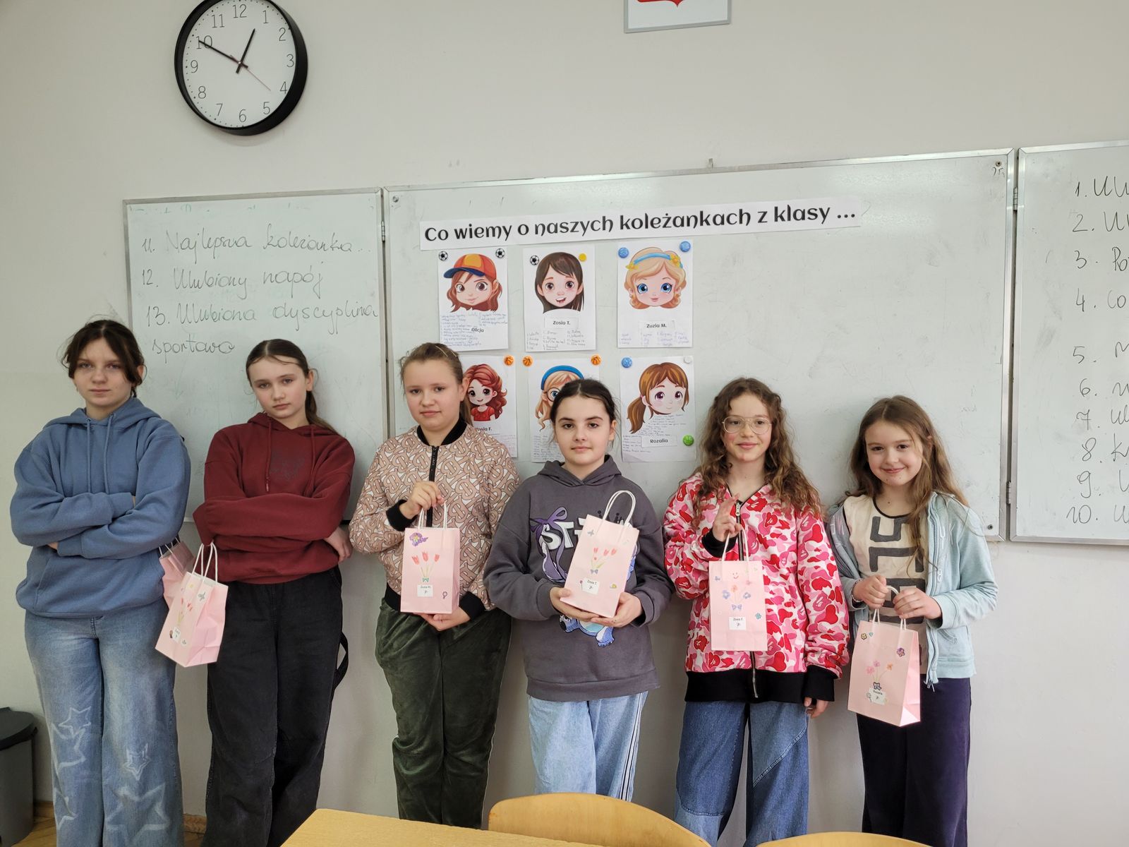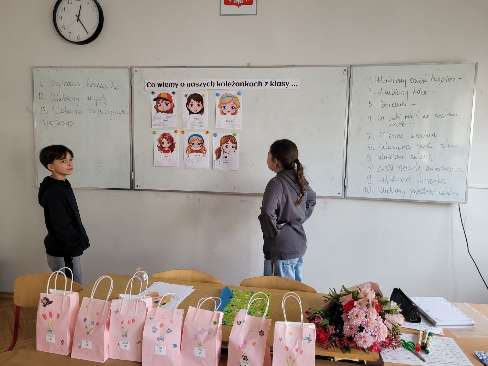 Z okazji Dnia Kobiet chłopcy z klasy 4b przygotowali dla koleżanek praktyczne i słodkie upominki. Chcieli również pokazać jak dobrze znają swoje dziewczyny. Losowali imię, następnie dobierali odpowiedni portret i odpowiadali na szereg pytań. Próbowali odgadnąć, np. upodobania, zainteresowania, potrawy, ulubione zwierzęta a nawet wymarzone miejsca swoich koleżanek. Różnie było z tą znajomością, jedno jest pewne, wszyscy – w tym szczególnym dla dziewczynek dniu- świetnie się bawili.