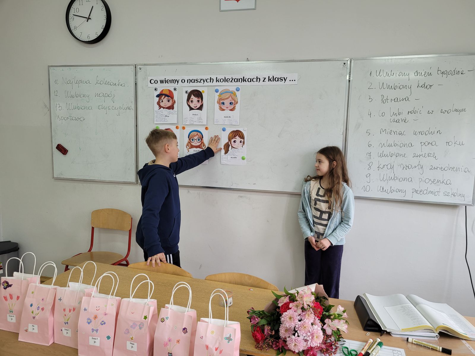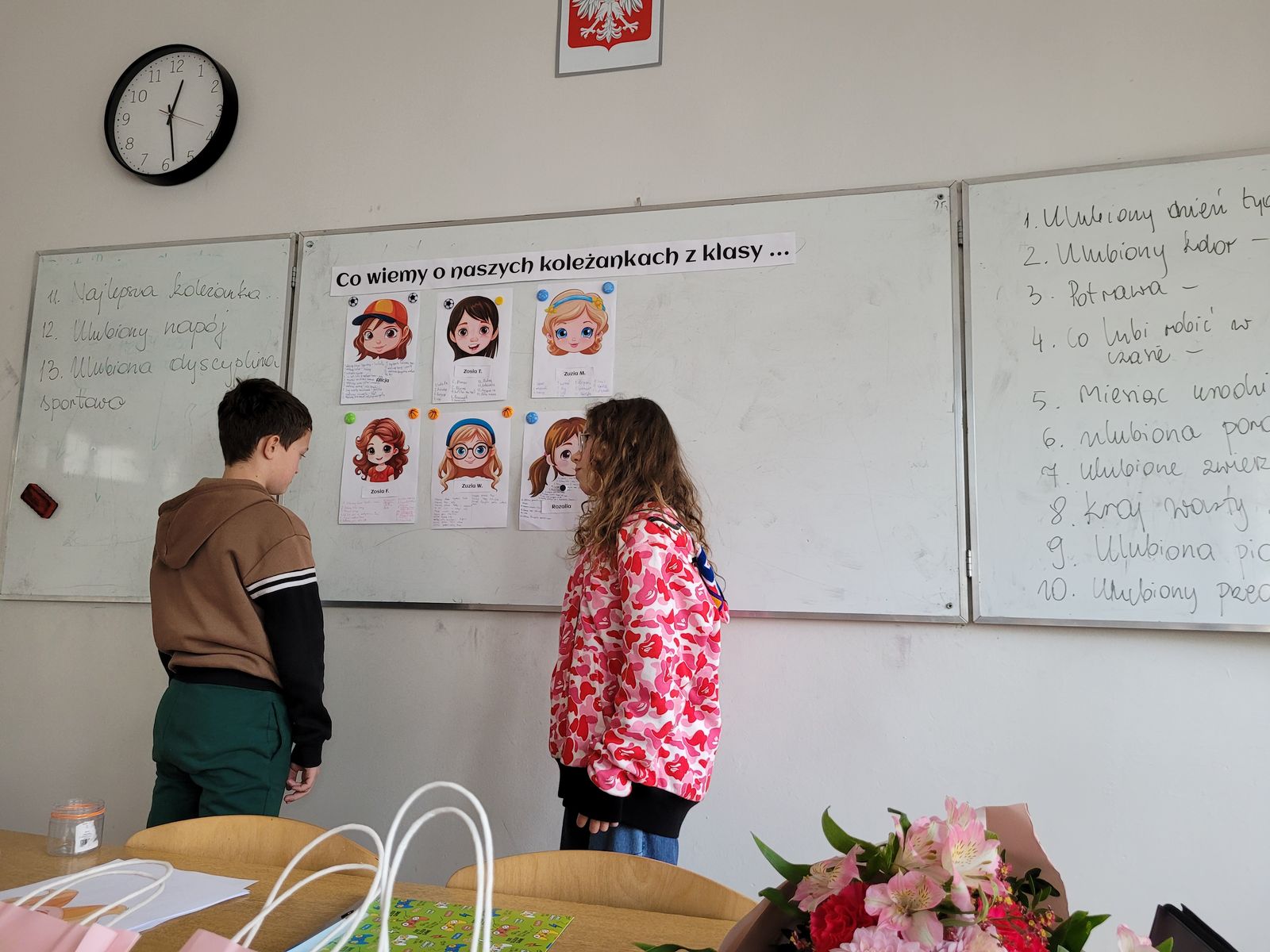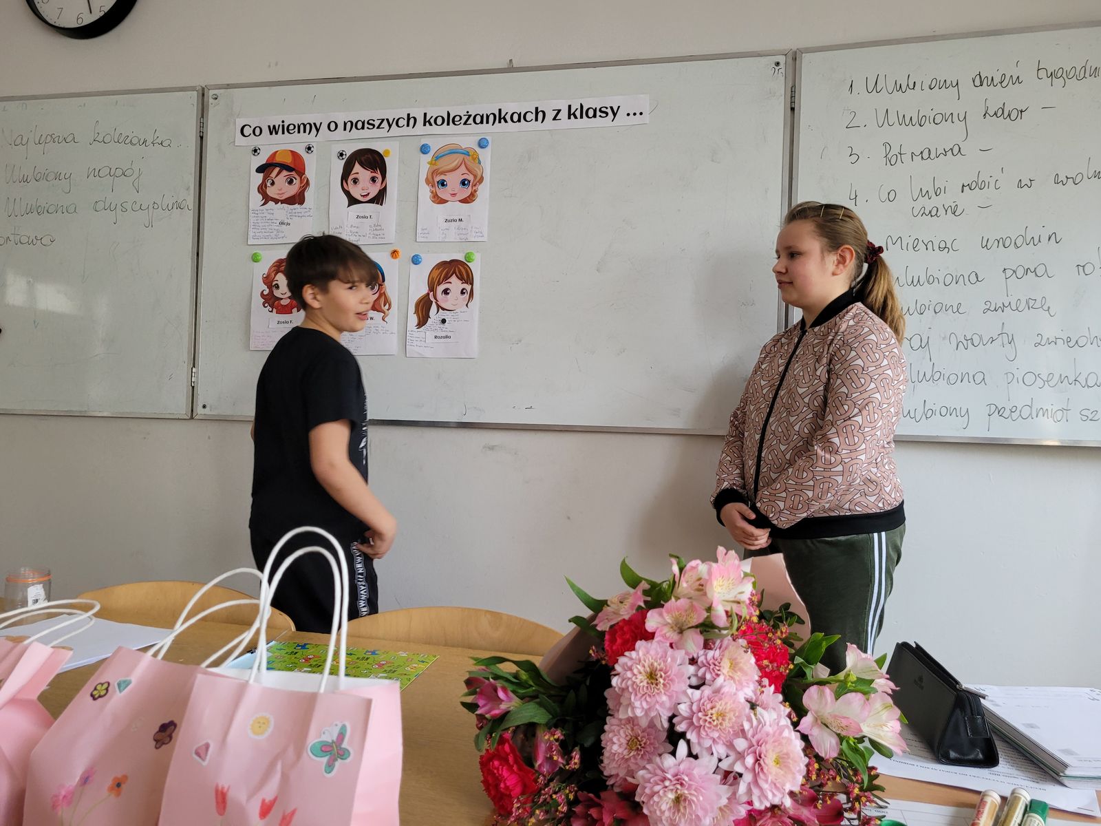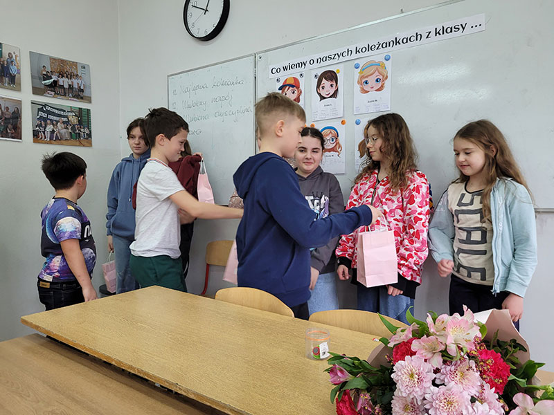 Z okazji Dnia Kobiet chłopcy z klasy 4b przygotowali dla koleżanek praktyczne i słodkie upominki. Chcieli również pokazać jak dobrze znają swoje dziewczyny. Losowali imię, następnie dobierali odpowiedni portret i odpowiadali na szereg pytań. Próbowali odgadnąć, np. upodobania, zainteresowania, potrawy, ulubione zwierzęta a nawet wymarzone miejsca swoich koleżanek. Różnie było z tą znajomością, jedno jest pewne, wszyscy – w tym szczególnym dla dziewczynek dniu- świetnie się bawili.